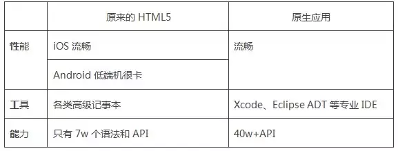 我们先谈谈HTML5原来不如原生应用的地方,业内俗称HTML5有“性工能”障碍。即HTML5性能不如原生、开发工具不如原生、能力调用不如原生。
